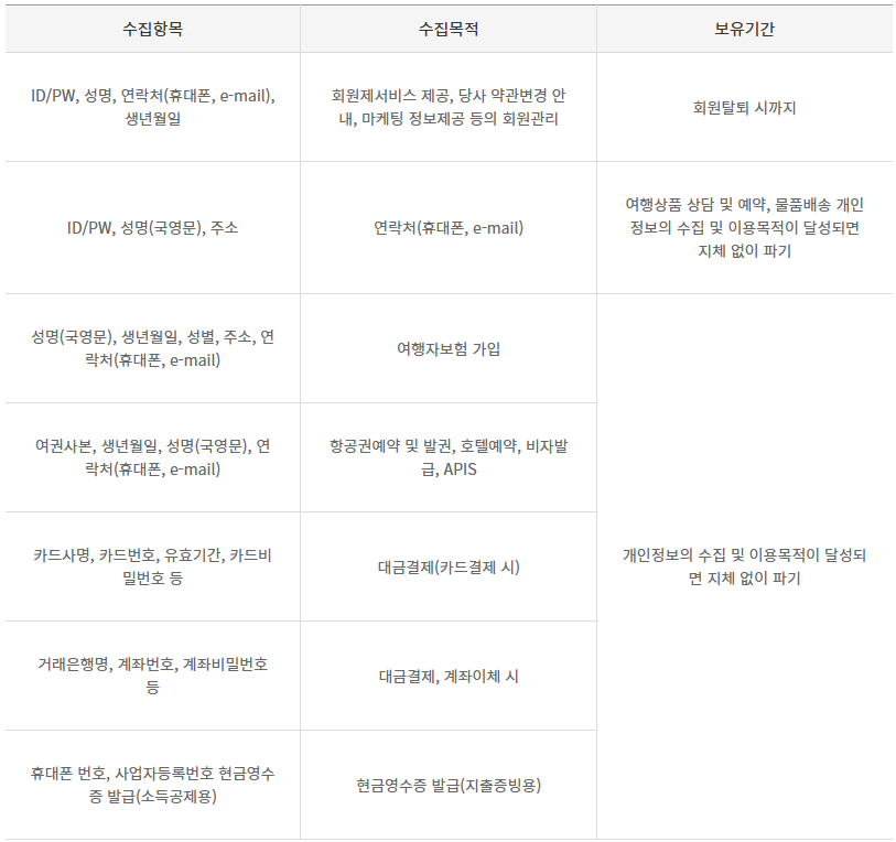 가. 서비스 제공에 관한 계약 이행 및 요금정산여행상품 상담 및 예약, 여행자보험 가입, 출국가능여부 파악(APIS), 항공권/호텔 예약내역의 확인 및 상담,