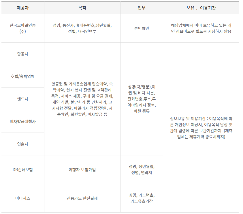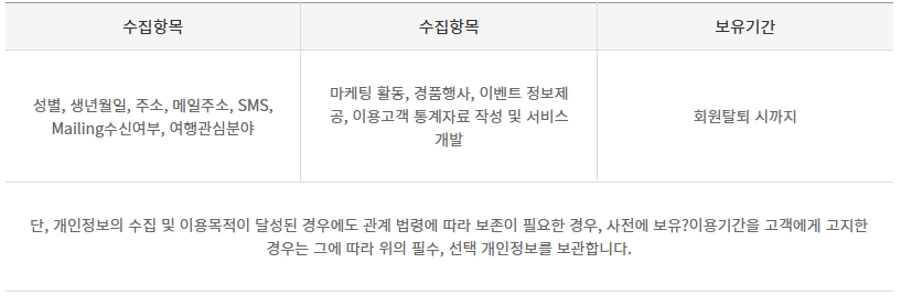 (여행컨텐츠 제공, 회원 우대서비스, 마일리지의 적립, 조회, 사용 및 이에 관한 안내)